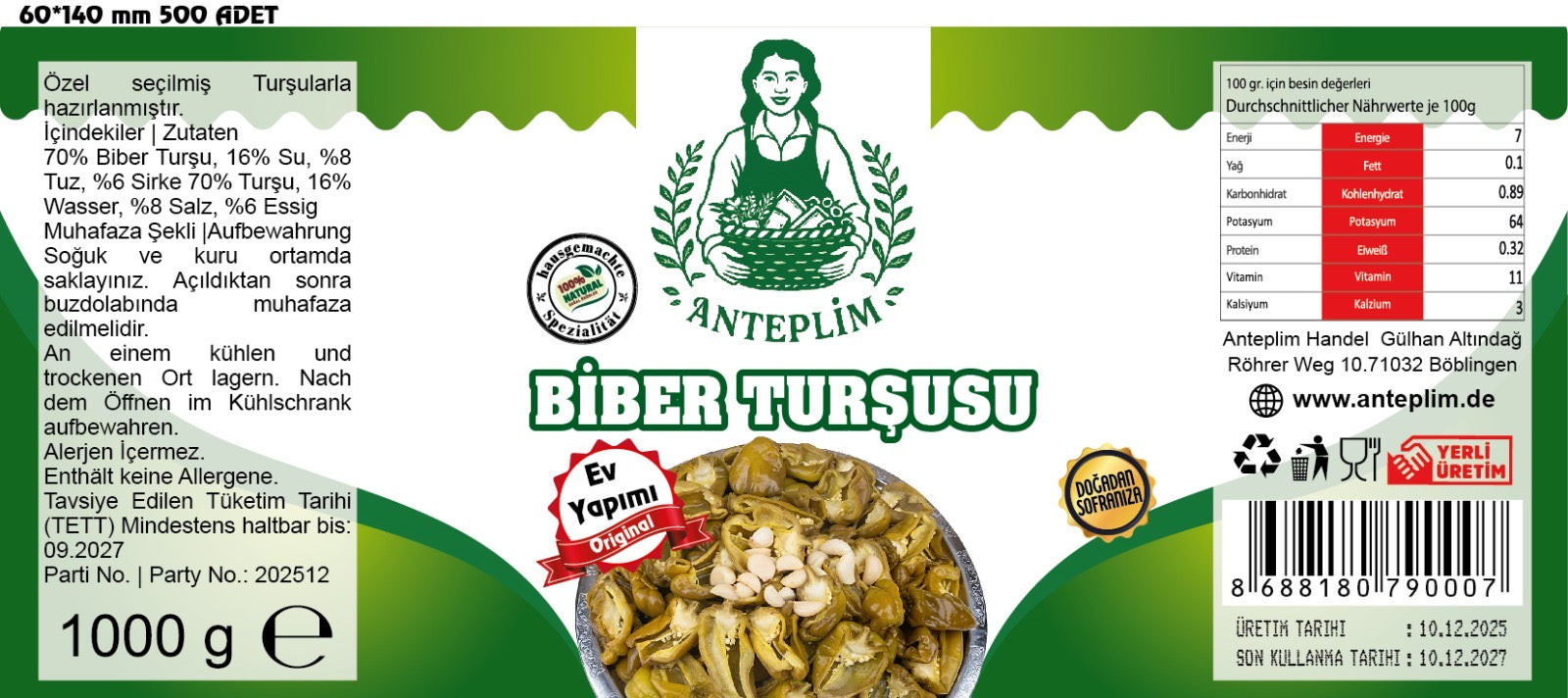 Für die Zubereitung werden frische, runde Topalak-Paprika sorgfältig ausgewählt und mit natürlichem Essig, Knoblauch, Salz und aromatischen Gewürzen fermentiert. Dadurch entsteht eine knackige, intensive und leicht scharfe Turşu, die perfekt den authentischen Geschmack der türkischen Küche widerspiegelt.