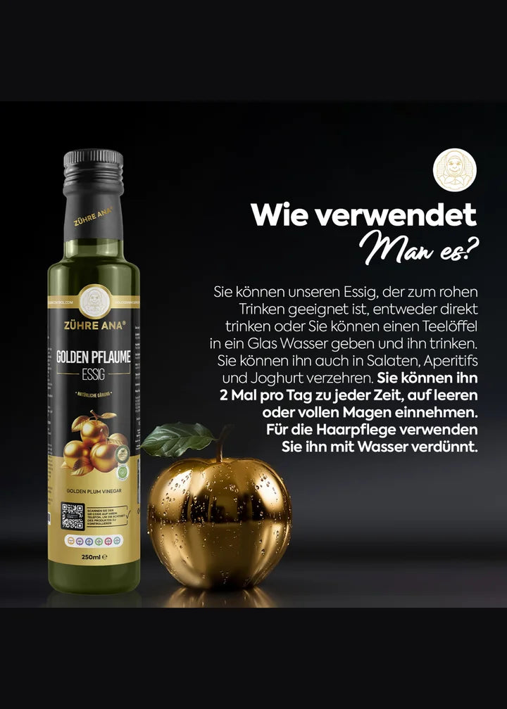 Zühre Ana Goldener Pflaumenessig wird aus sorgfältig fermentierten goldenen Pflaumen (Goldmirabellen) hergestellt. Die schonende Natürliche Fermentation bewahrt die fruchtig-feine Säure und das leicht süße Aroma – eine besondere Delikatesse für moderne, gesundheitsbewusste Küche.
