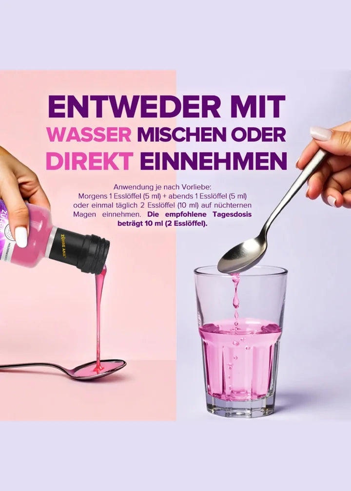 Vor Gebrauch gut schütteln. Täglich 5 ml pur oder in Getränk, Frühstück oder Dessert einrühren.