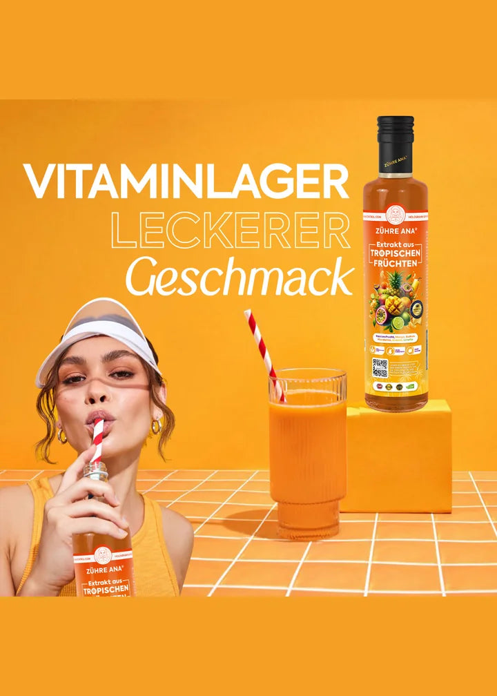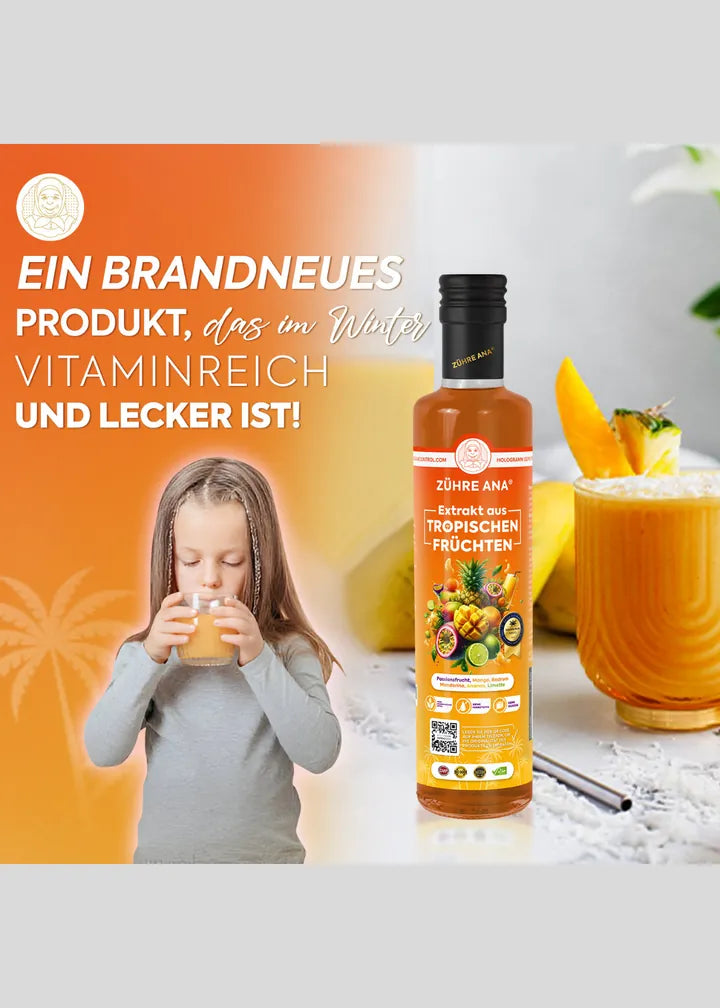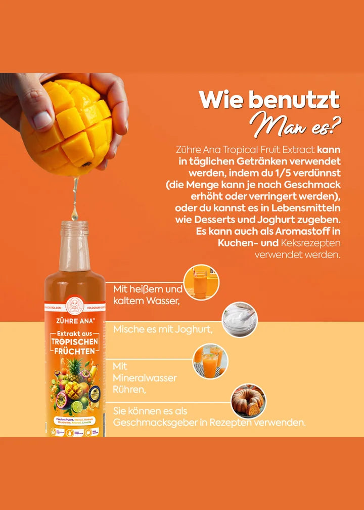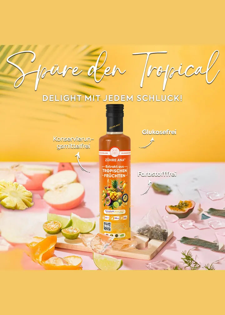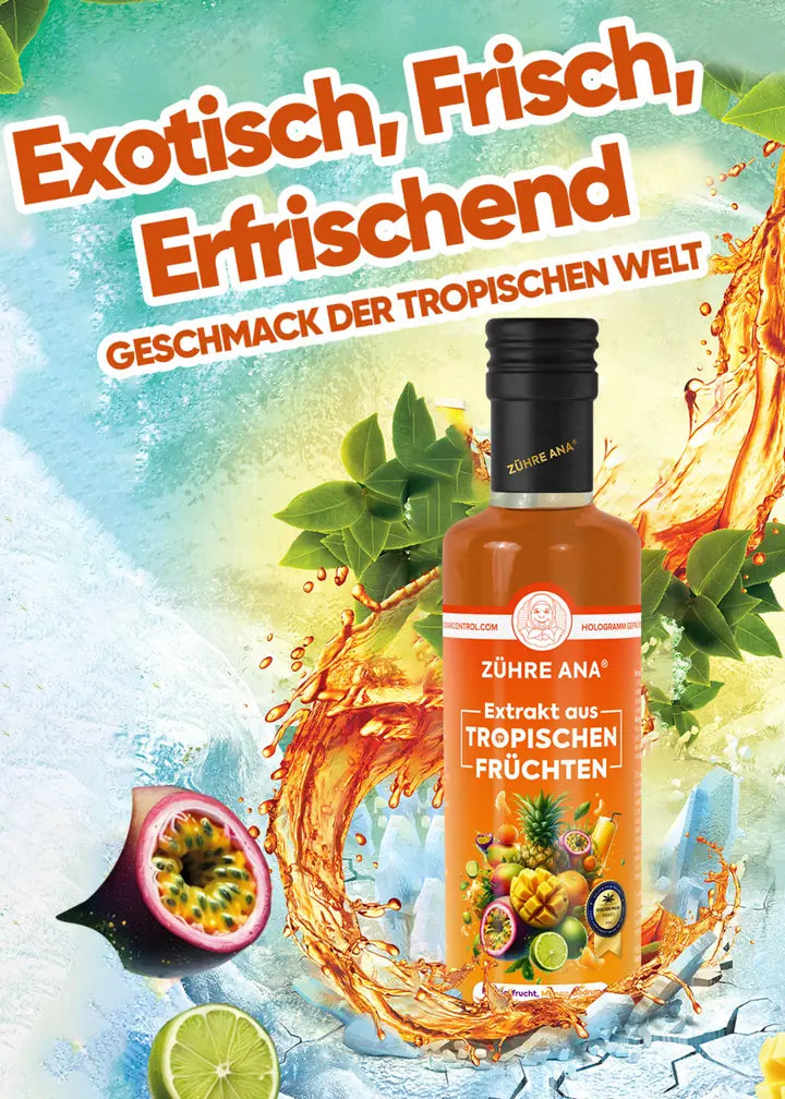 Zühre Ana Tropischer Fruchtextrakt vereint die süßen und saftigen Aromen exotischer Früchte wie Passionsfrucht, Mango, Ananas, Limette und Mandarine zu einer harmonischen Mischung. Mit seinem intensiven Geschmack bringt er tropische Frische direkt in Ihre Küche.