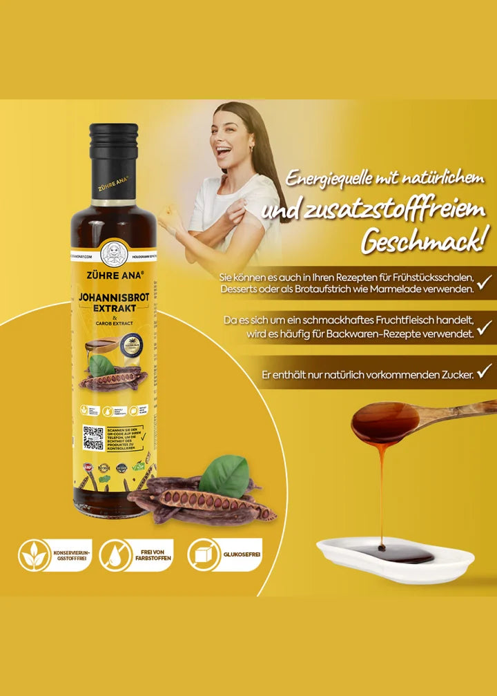 Zühre Ana Keçiboynuzu Özü, tamamen %100 doğal ve katkısız bir üründür. Yoğun aroması ve besin değeri ile günlük yaşamda çok yönlü kullanım sunar. Kahvaltılarda, tatlılarda, içeceklerde ve fırın tariflerinde doğal tatlandırıcı olarak tercih edilebilir.